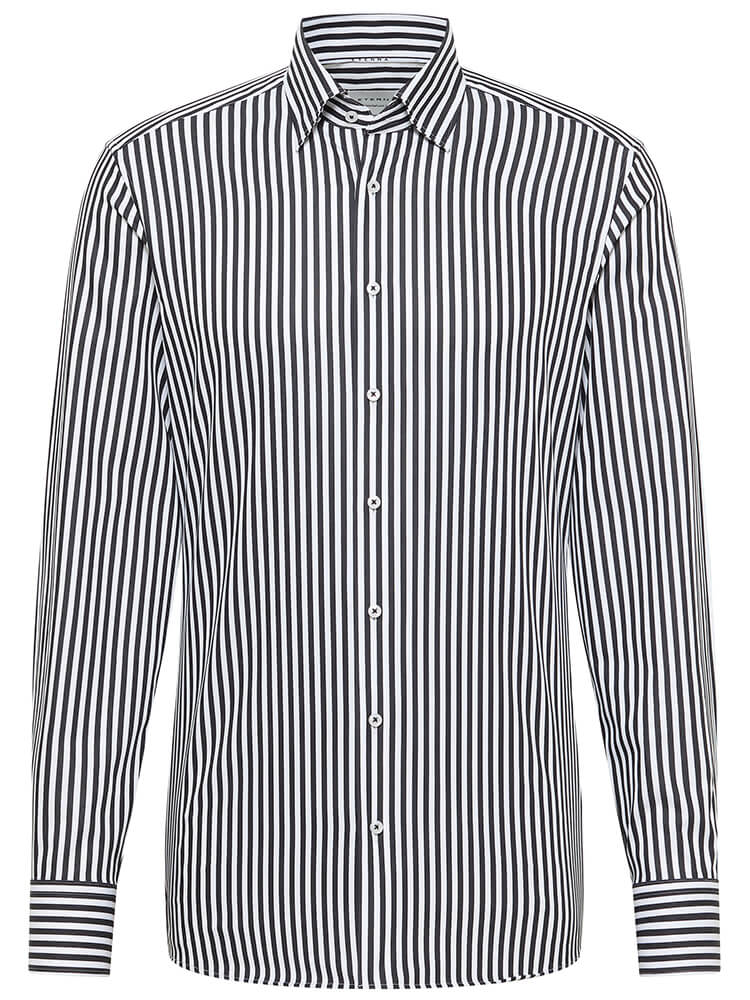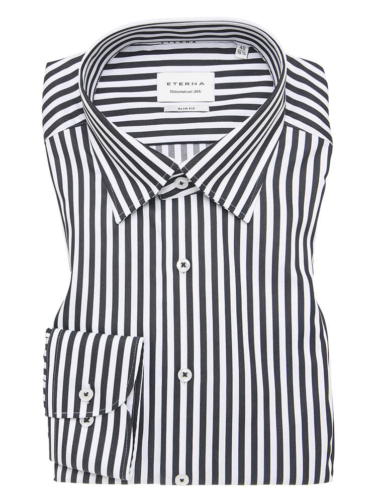 The elegant business shirt from the ETERNA Slim Fit collection represents the slim, fashion-conscious man of today. A slim fit combined with fashionable details promise a high level of comfort and make this shirt a combination artist. The striped men's shirt in the colour black should not be missing from any man's wardrobe and can be worn with the elegant and classic Under-Button-down collar for any occasion as well as in everyday life. This ETERNA Slim Fit men's shirt looks best with a narrow tie and a small tie knot.