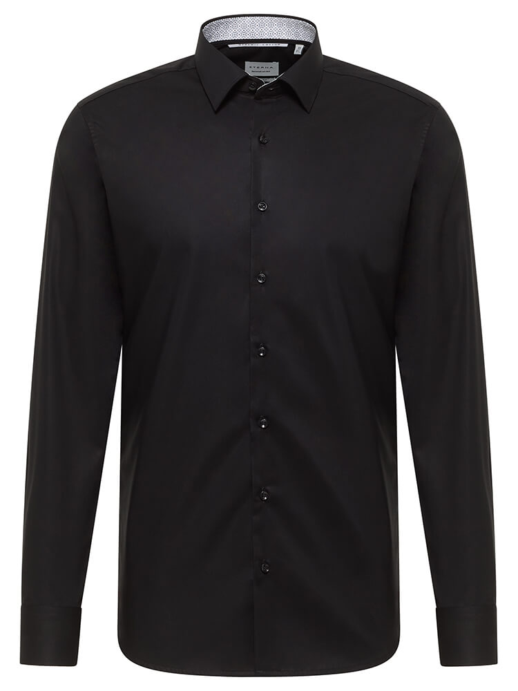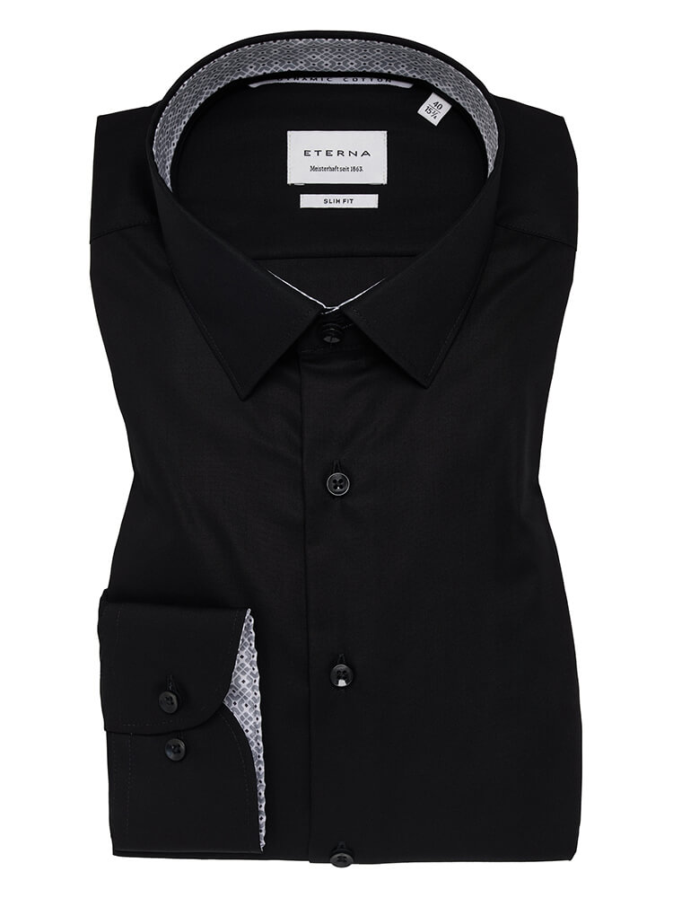 The elegant business shirt from the ETERNA Slim Fit collection represents the slim, fashion-conscious man of today. A slim fit combined with fashionable details promise a high level of comfort and make this shirt a combination artist. The plain men's shirt in the colour black should not be missing from any man's wardrobe and can be worn with the elegant and classic Kent collar for any occasion as well as in everyday life. This ETERNA Slim Fit men's shirt looks best with a narrow tie and a small tie knot.