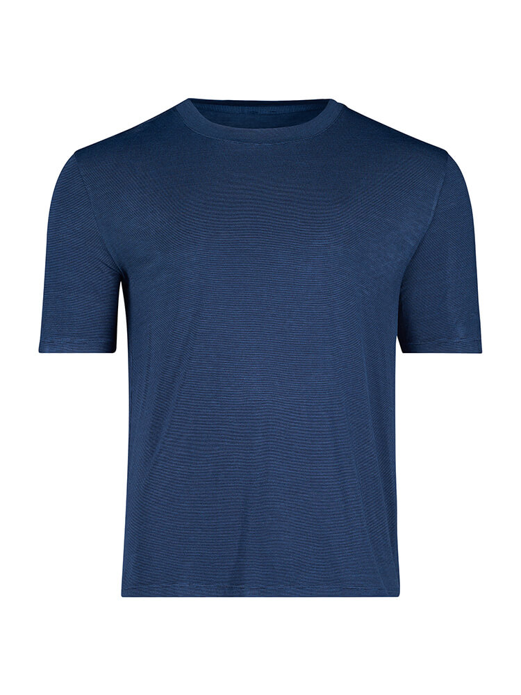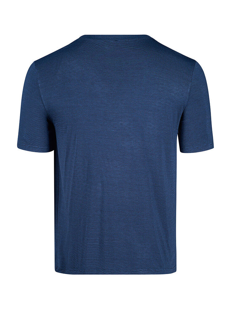La camiseta SKINY Cooling Deluxe Night en azul marino con rayas ofrece una sensación ligera y transpirable. Su suave tejido de punto, compuesto por un 95 % de viscosa y un 5 % de elastano, garantiza comodidad y una óptima libertad de movimiento. Con cuello redondo, manga corta y corte holgado, esta camiseta es muy cómoda. Es lavable a máquina, fácil de planchar y una prenda básica de bajo mantenimiento para el día a día y el tiempo libre.
