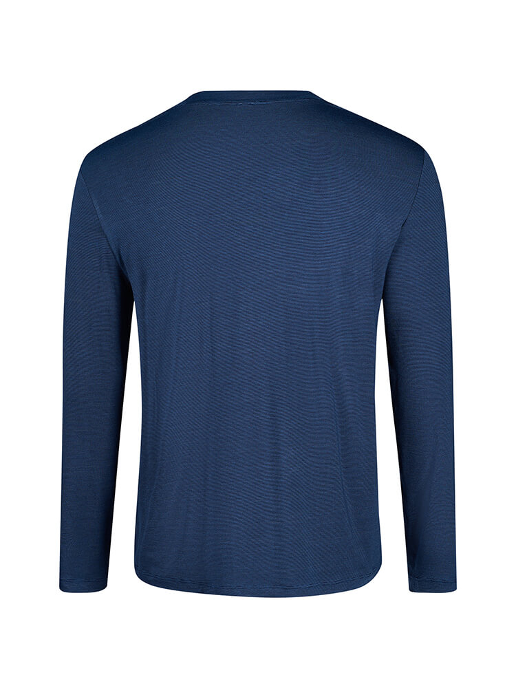 La camiseta SKINY Cooling Deluxe Night, de color azul marino con rayas, ofrece una sensación ligera y transpirable. Su suave tejido de punto, compuesto por un 95 % de viscosa y un 5 % de elastano, garantiza una gran comodidad y una óptima libertad de movimiento. Con cuello redondo, mangas largas y un corte holgado, esta camiseta es excepcionalmente cómoda. Es lavable a máquina, fácil de planchar y de fácil cuidado.